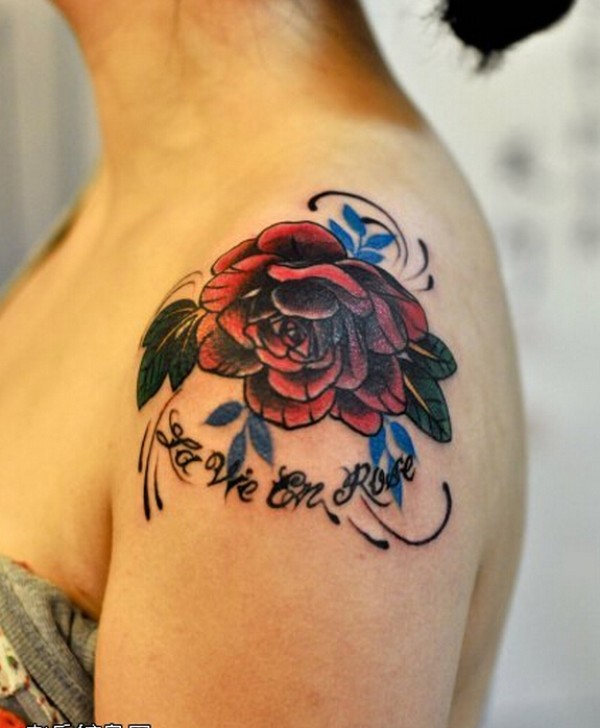 女生肩部精美好看的彩色玫瑰花纹身图图片