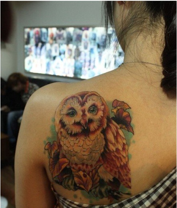 女生肩背时尚好看经典的猫头鹰纹身图图片