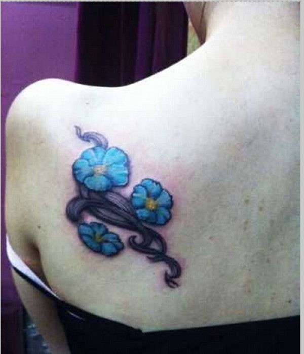 肩部上三朵蓝色漂亮好看的花朵纹身图图片