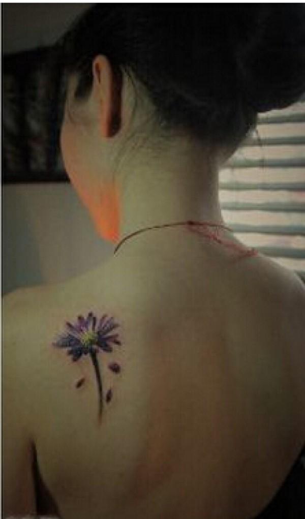 女孩子肩背精美好看的彩色小邹菊纹身图片
