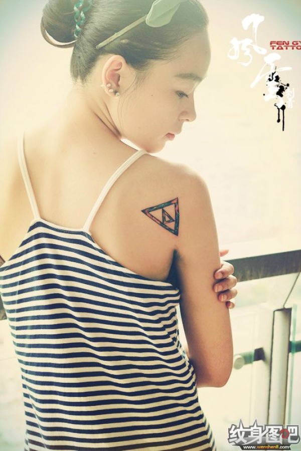 美女肩膀上的个性彩色小三角纹身图