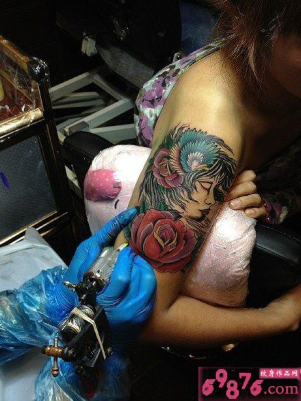 手臂女性与玫瑰纹身图案现场图片