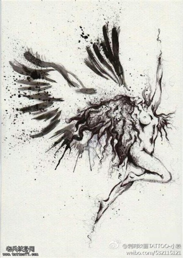 泼墨风格天使纹身手稿图片