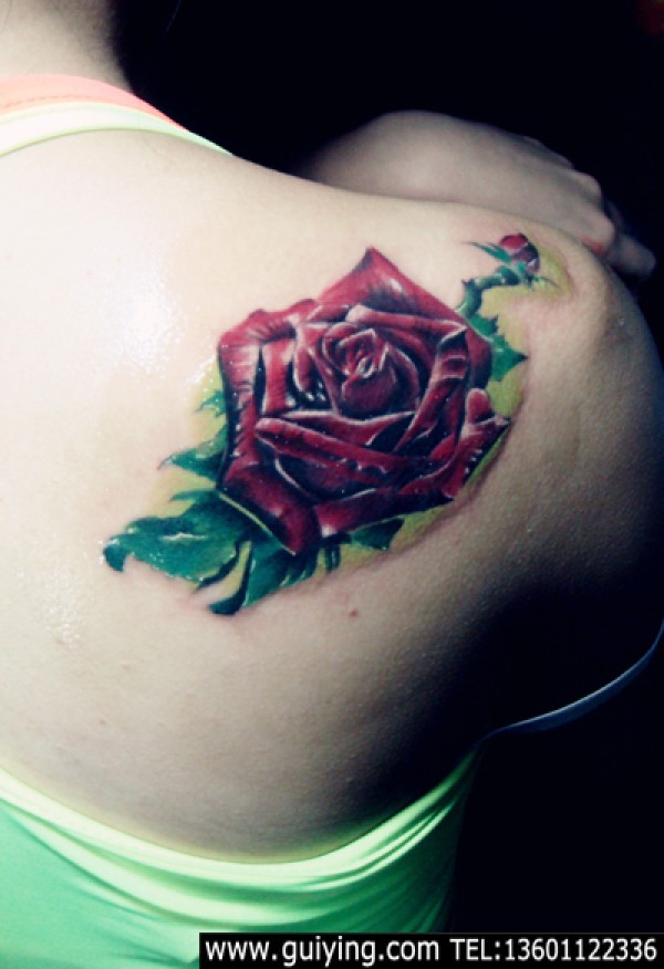 肩部红色玫瑰纹身