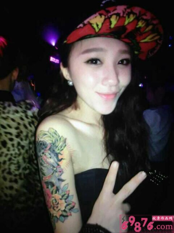清新美女时尚花臂个性纹身图片