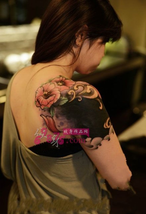 女生肩花纹身_15张女性双肩对称的肩花纹身图案作品图片
