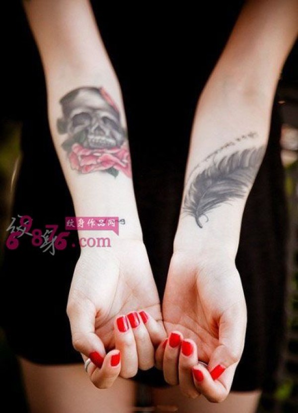 唯美骷髅羽毛小臂纹身图片