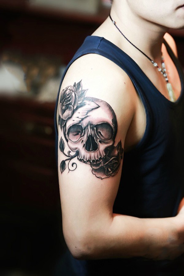 女生手臂经典潮流的骷髅与玫瑰花纹身图案