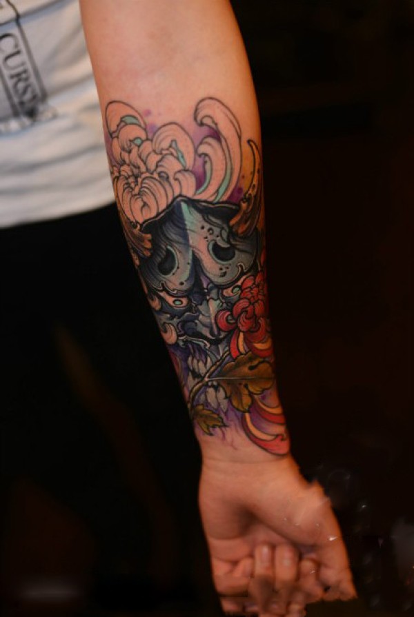 另类彩色骷髅面具手臂纹身图片