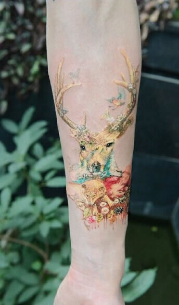 小臂上的黄金梅花鹿与狐狸彩色纹身图图片