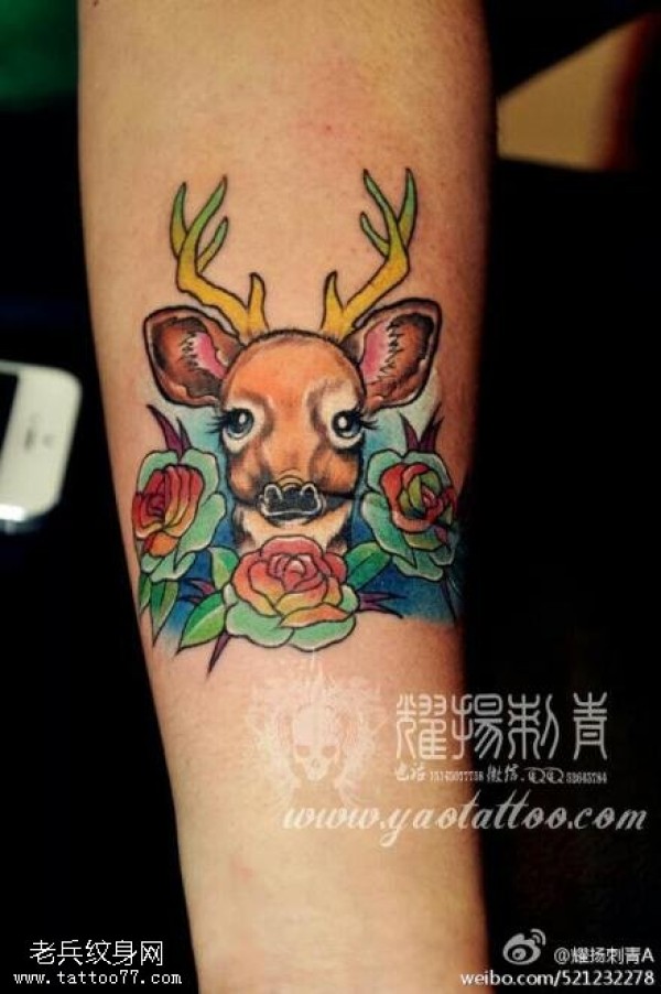手臂彩色鹿玫瑰纹身图案