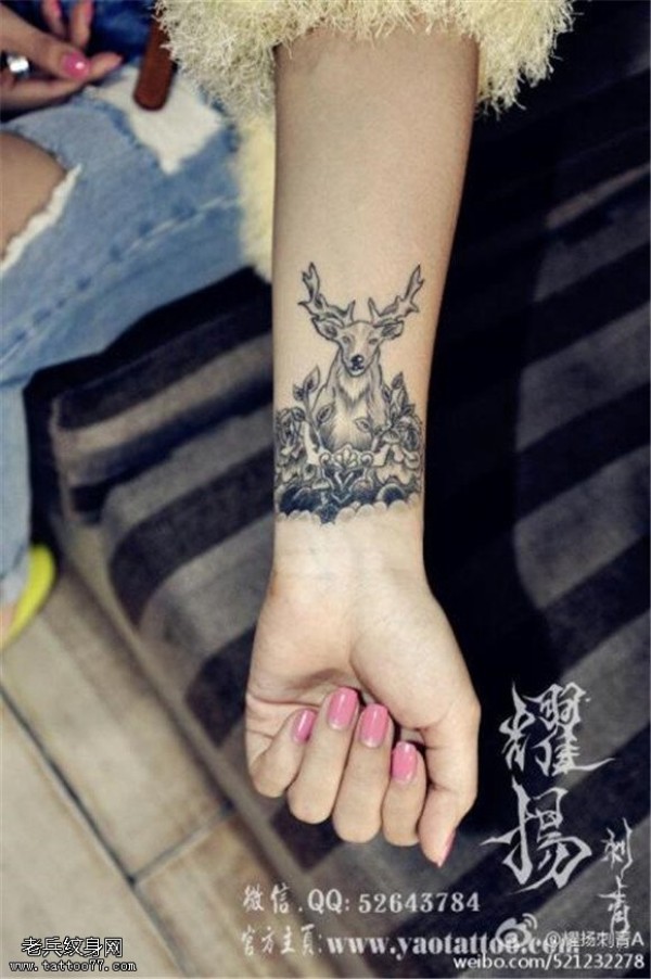 手腕羚羊玫瑰花纹身图案