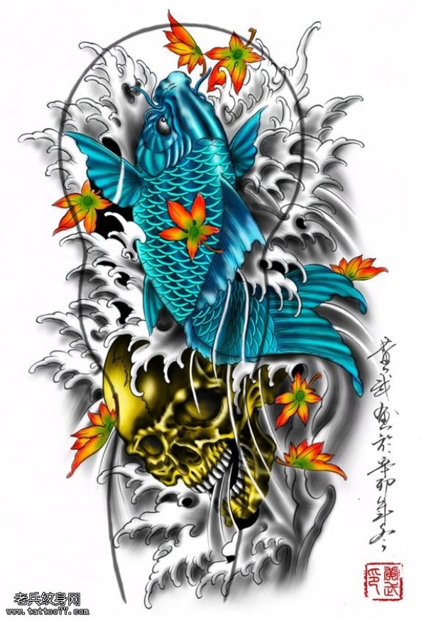 一款花臂鲤鱼纹身图案