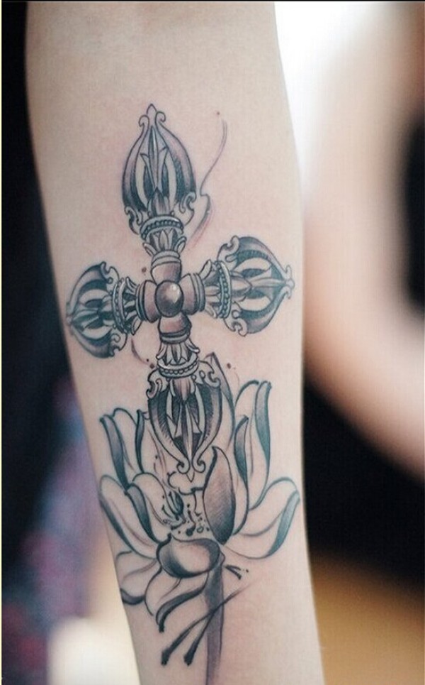 漂亮手臂水墨荷花与十字金刚杵纹身图图片