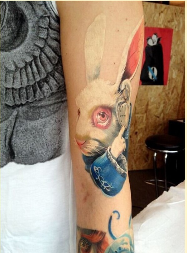 一款手臂时尚欣赏彩色兔子纹身图案