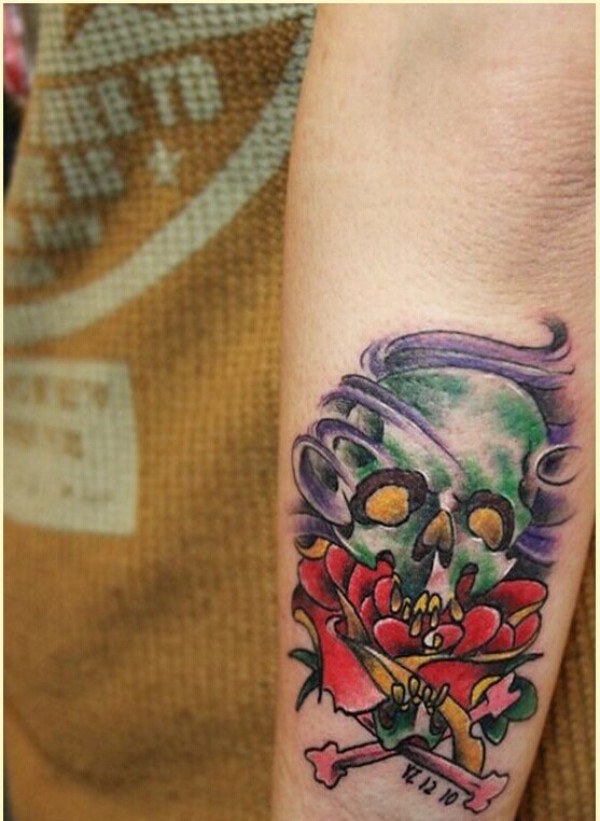 女生手臂经典潮流的骷髅与玫瑰花纹身图案