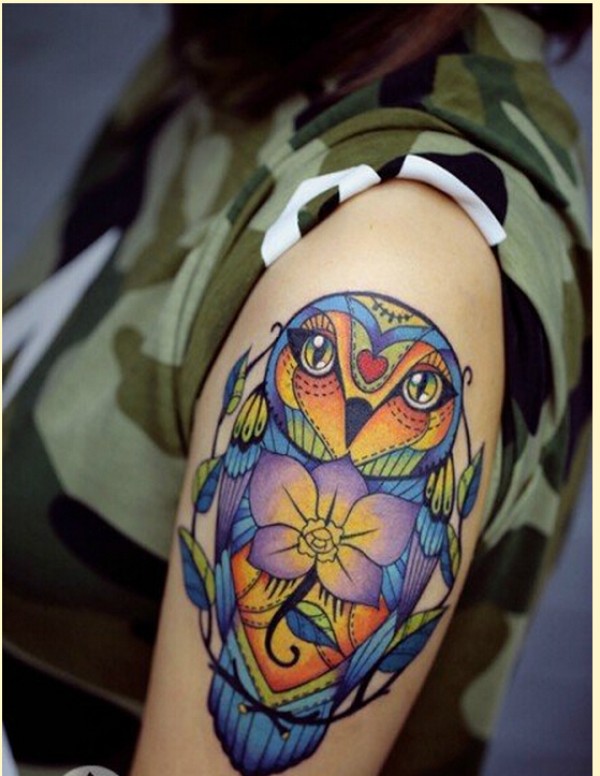 个性女生手臂好看的彩色猫头鹰纹身图图片