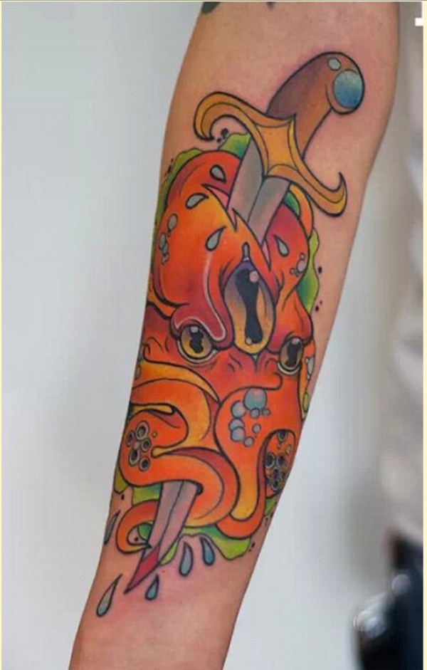 时尚手臂好看的彩色匕首章鱼纹身图案