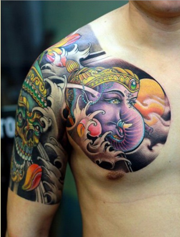 个性时尚半胛彩色象神嘎巴拉纹身图案