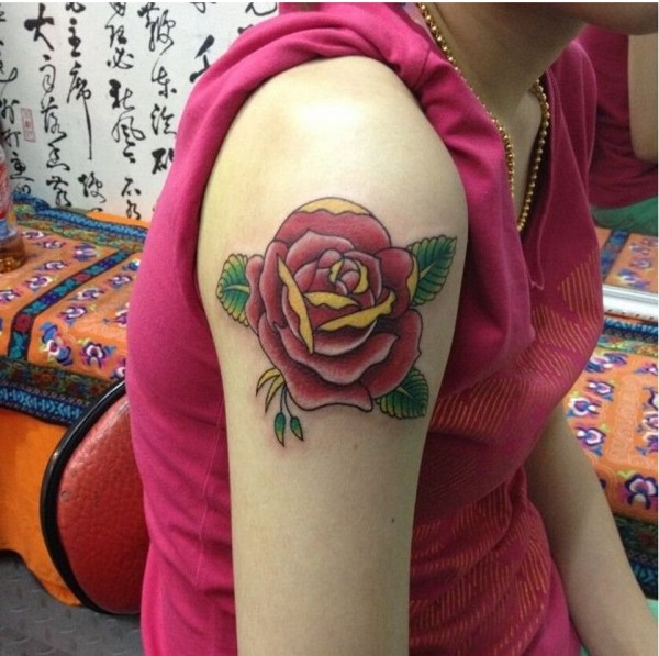 漂亮手臂上红色娇滴的玫瑰纹身图案