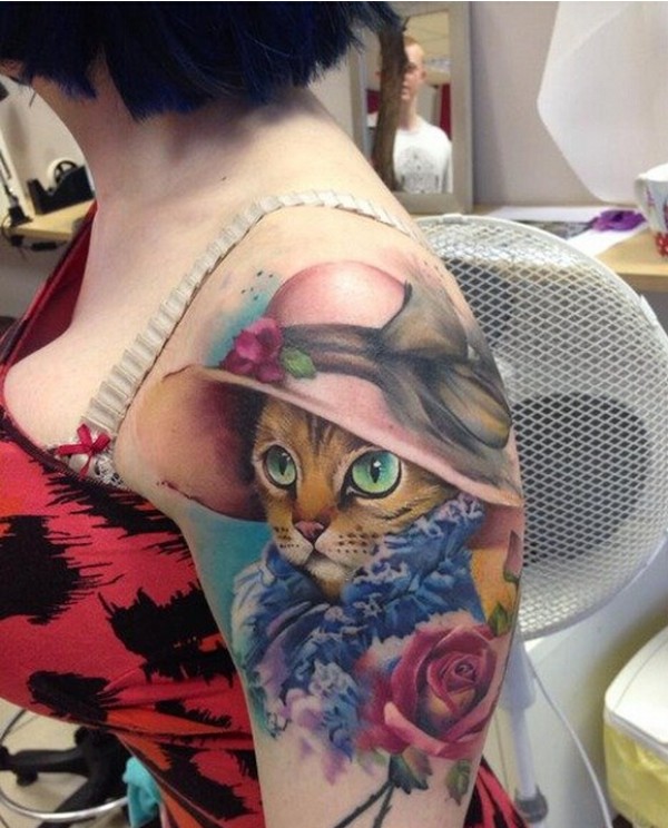 时尚女生胳膊好看的彩色猫咪纹身图案