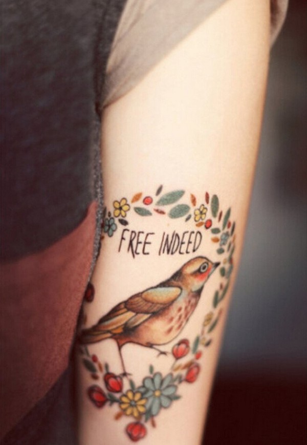 女生手臂漂亮好看的小鸟小花彩色纹身图片