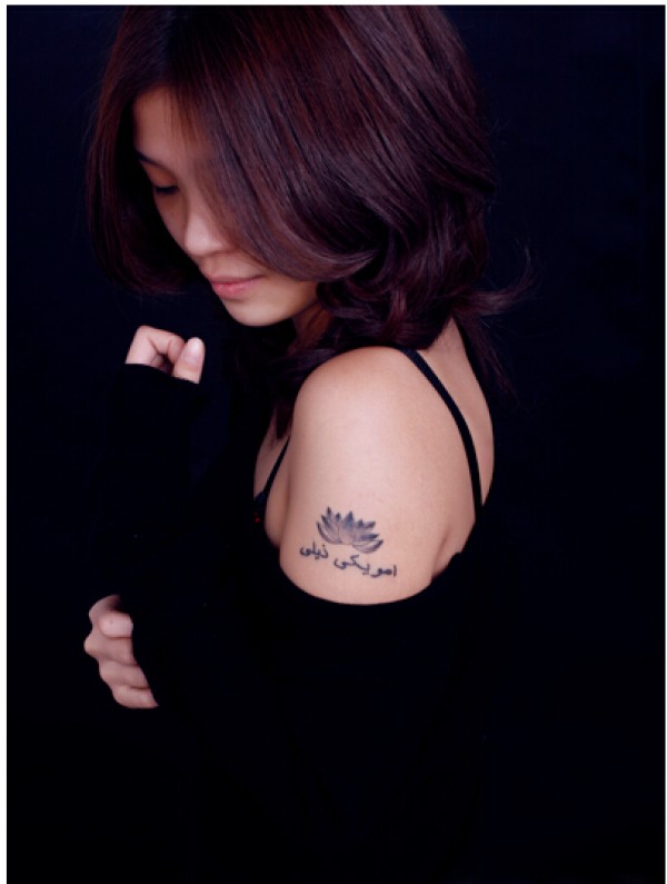 美女大臂唯美好看的莲花文字纹身图案