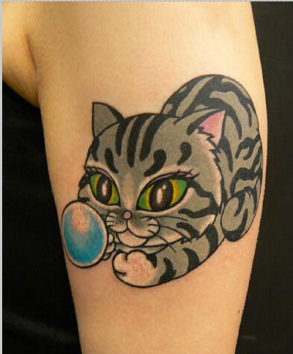 手臂上超萌超好看的小猫玩球纹身
