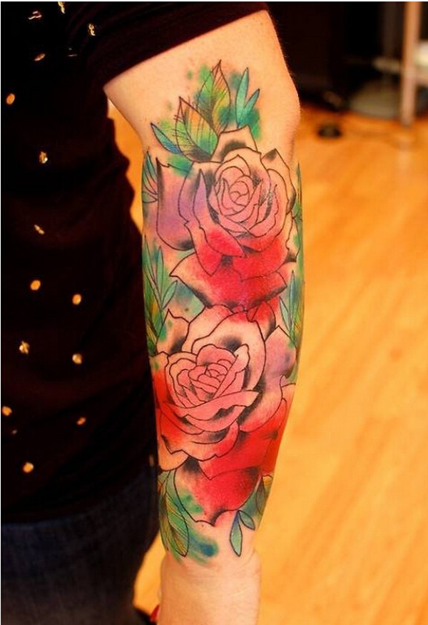 时尚手臂好看的彩色泼墨玫瑰花纹身图图片