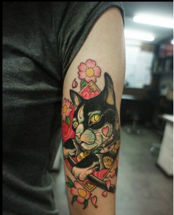 手臂上唯美好看的彩色猫咪玫花纹身图图片