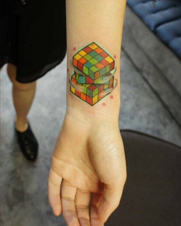 女生手腕时尚好看的彩色魔方纹身