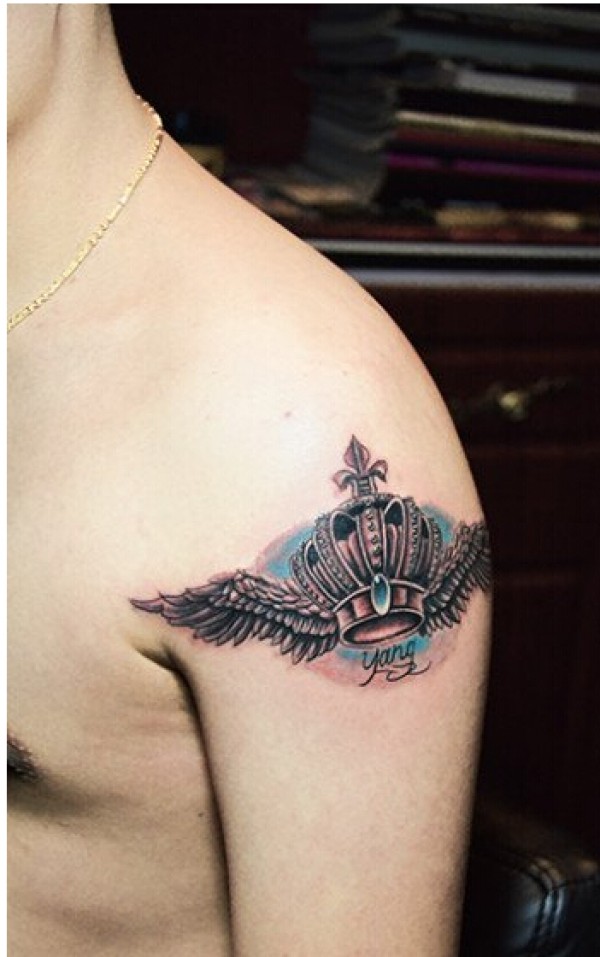 个性男士手臂时尚好看的皇冠翅膀纹身图片