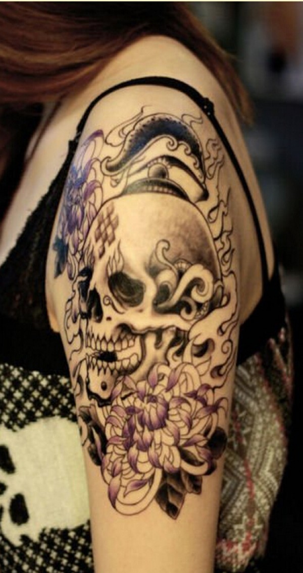 女生手臂时尚好像骷髅菊花纹身图案