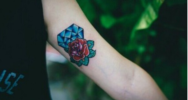 手臂漂亮好看的彩色钻石玫瑰花纹身图图片