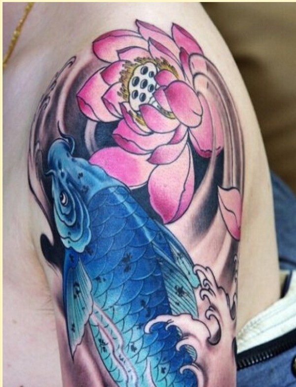 个性手臂时尚好看的彩色鲤鱼莲花纹身图片