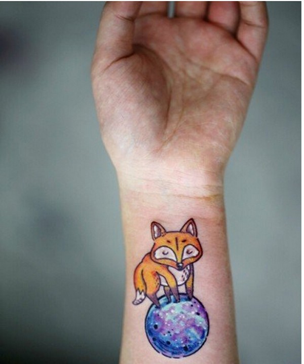 女生手腕漂亮好看的彩色星空狐狸纹身图片