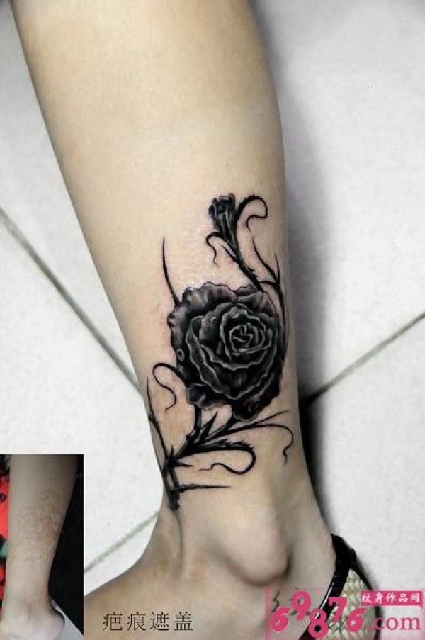 腿部疤痕遮盖黑玫瑰纹身图片