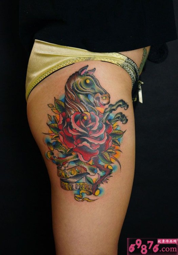 彩绘马与玫瑰性感大腿纹身图片