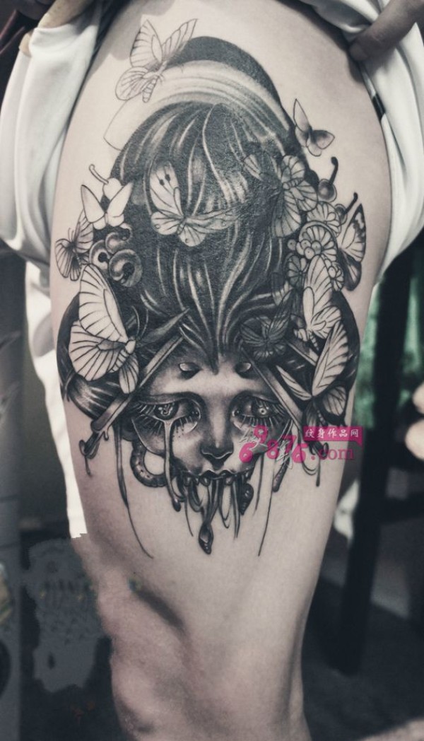 流泪的艺妓大腿纹身图片