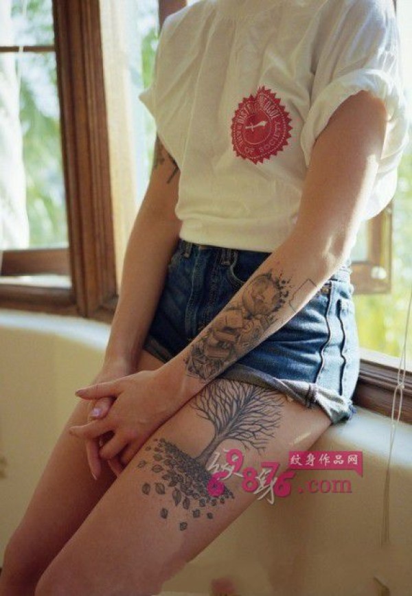 唯美大腿小树时尚纹身图片