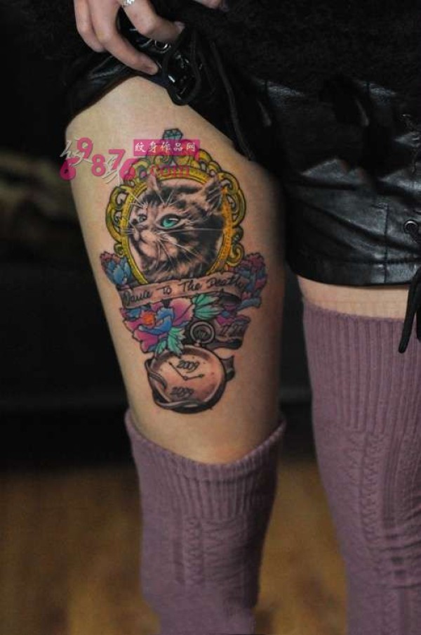 复古镜框猫咪大腿纹身图片