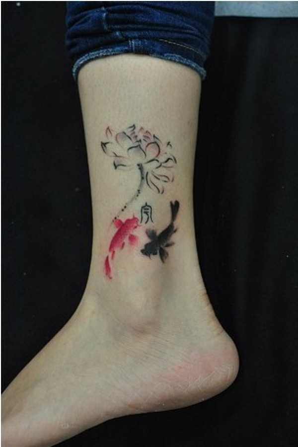 美女腿部水墨画鲤鱼莲花纹身图案纹身图片