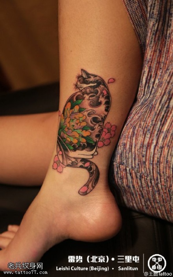 日式可爱花猫纹身图案