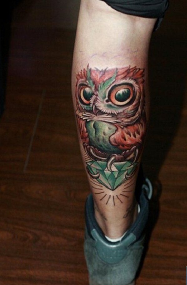 一张腿部彩色猫头鹰纹身图案 图片