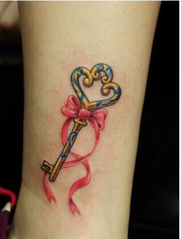女生小腿漂亮好看金锁匙纹身