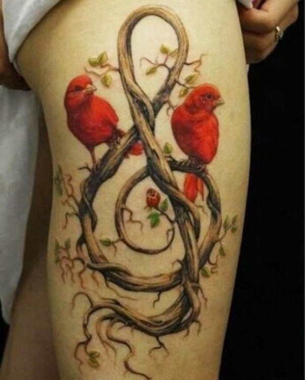 美女腿部唯美时尚树根音乐符小鸟纹身图片