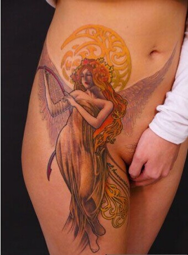 女生大腿侧部的女神纹身图片