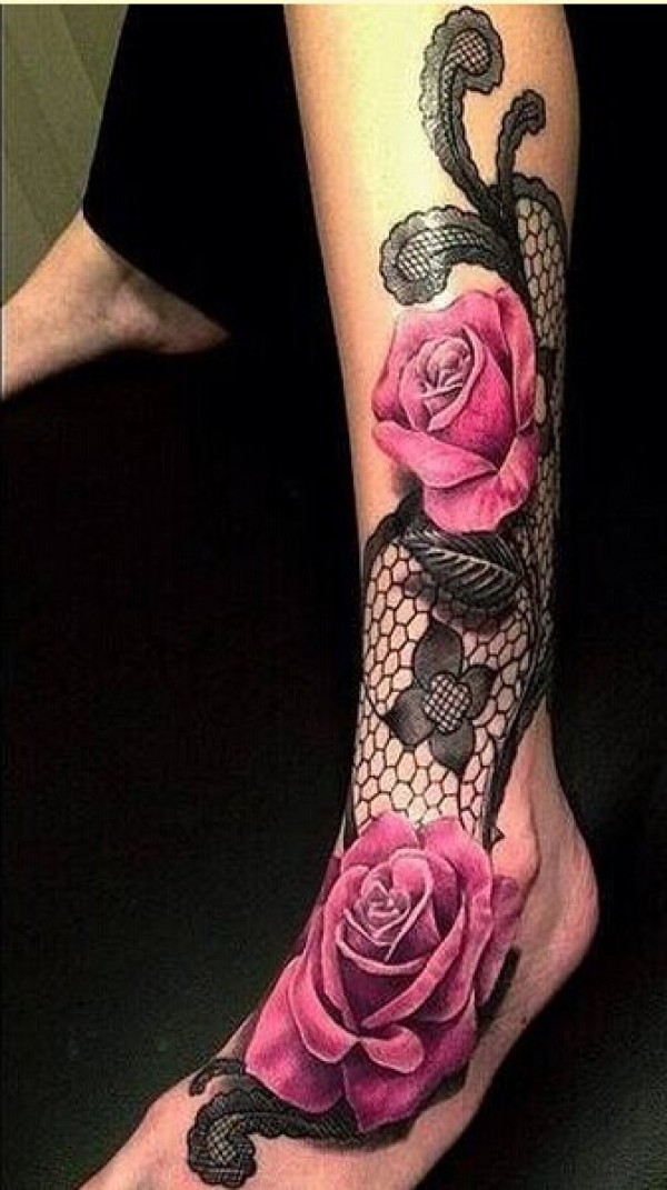 腿部玫瑰花蕾丝纹身