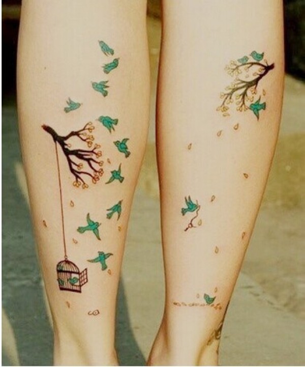 女生腿部唯美清新群小鸟飞翔图纹身图片