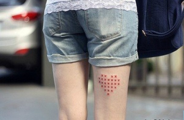 腿部红色桃心纹身